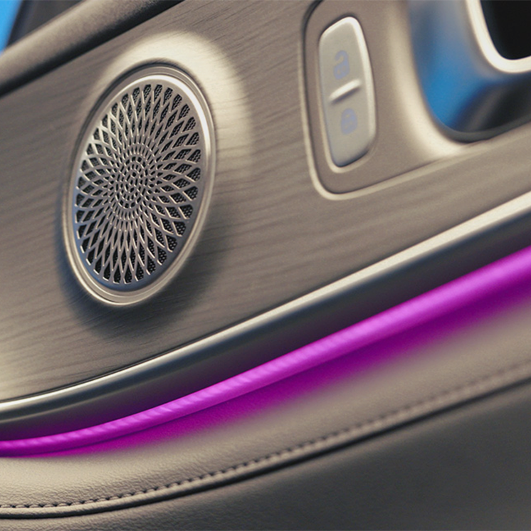 Showcase the interior according to your personal preferences or current mood. The 64 colours of ambient lighting create exciting colour schemes, which can alternate dynamically or be set to illuminate several areas in different colours.